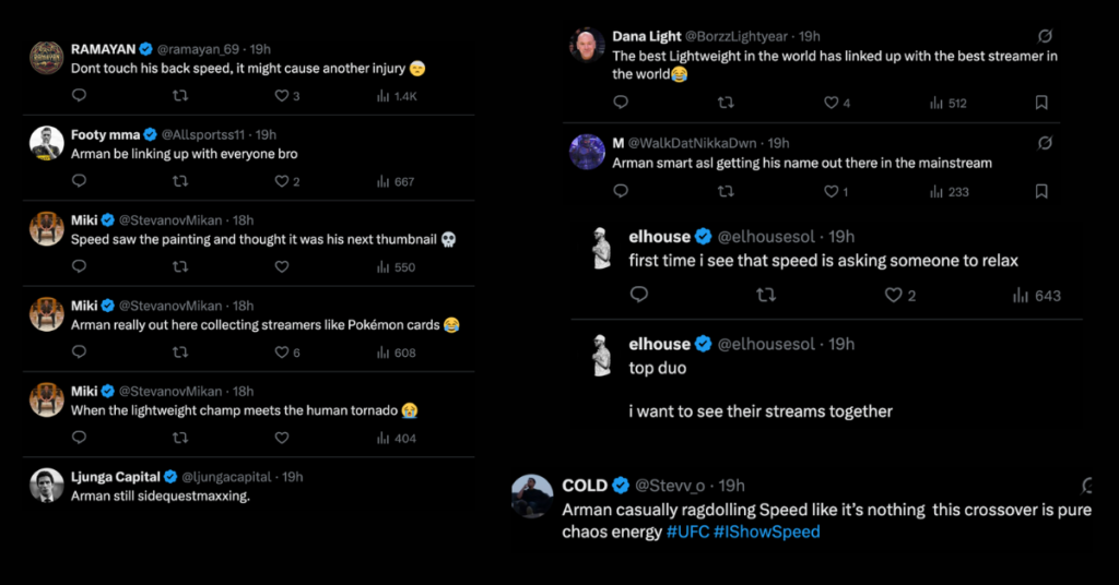 «Арман непринужденно швыряет Спида, будто это ничего не значит, этот кроссовер — чистая энергия хаоса #UFC #IShowSpeed»